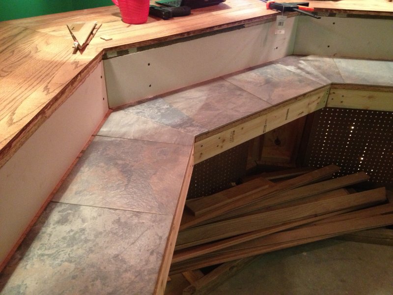 Then I moved on to start the final leg of the bar. I consulted with the Mrs. about the finish on the lower countertop. I didn’t want wood like the main upper level, and I wasn’t really fond of a typical glossy solid color ceramic 4×4 tile. As you’ll see in the pics, we batted around the idea of the same tile that is on the front of the bar but I didn’t fancy the thought of placing eleventy thousand of them. So, you guessed it, off to Lowe’s! We settled on a ceramic tile that is printed to look similar to a slate stone. I sorted through about 6 boxes to get the 40ish I needed all in a grey family as usually 1/3 to 1/2 of the box were heavily weighted in the brown tones. I feel sorry for the poor bastard that comes home with 10 boxes and wonders why he only has 5 grey tiles 🙂